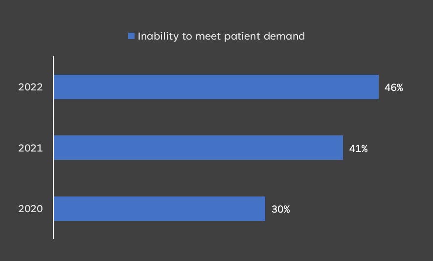 Psychologist’s reports of inability to keep up with patient demand increased from 30% in 2020 to 41% in 2021 to 46% in 2022 (APA survey)